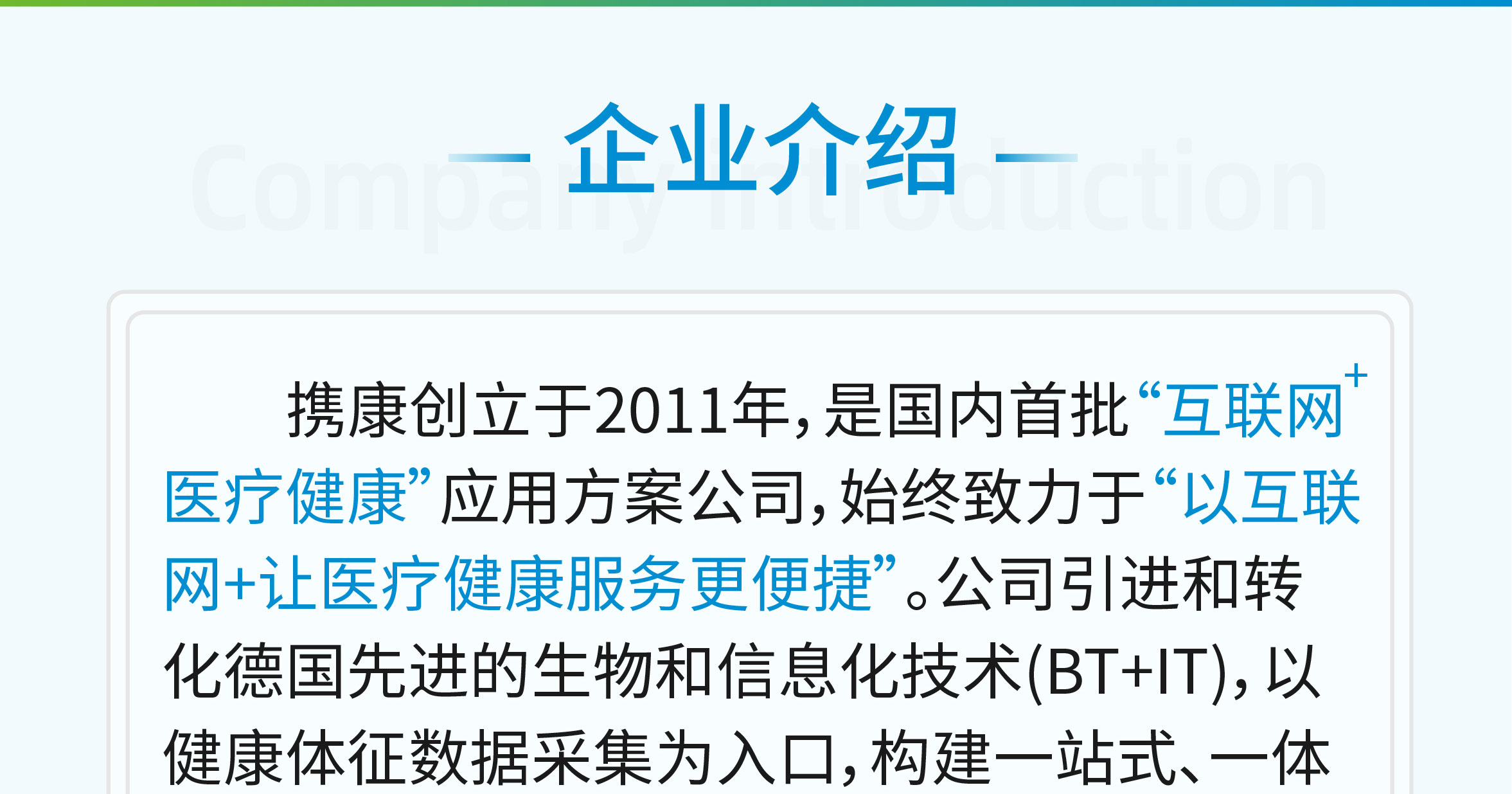 深圳市攜康網(wǎng)絡(luò)科技有限公司成立于2011年,是一家集智能醫(yī)學(xué)檢測設(shè)備研發(fā)生產(chǎn)、醫(yī)療健康應(yīng)用軟件開發(fā)及Al、健康云等“互聯(lián)網(wǎng)+醫(yī)療健康”解決方案為一體的國家高新技術(shù)企業(yè)與雙軟認(rèn)證企業(yè),也是深圳首批“互聯(lián)網(wǎng)+醫(yī)療健康”領(lǐng)軍企業(yè)。