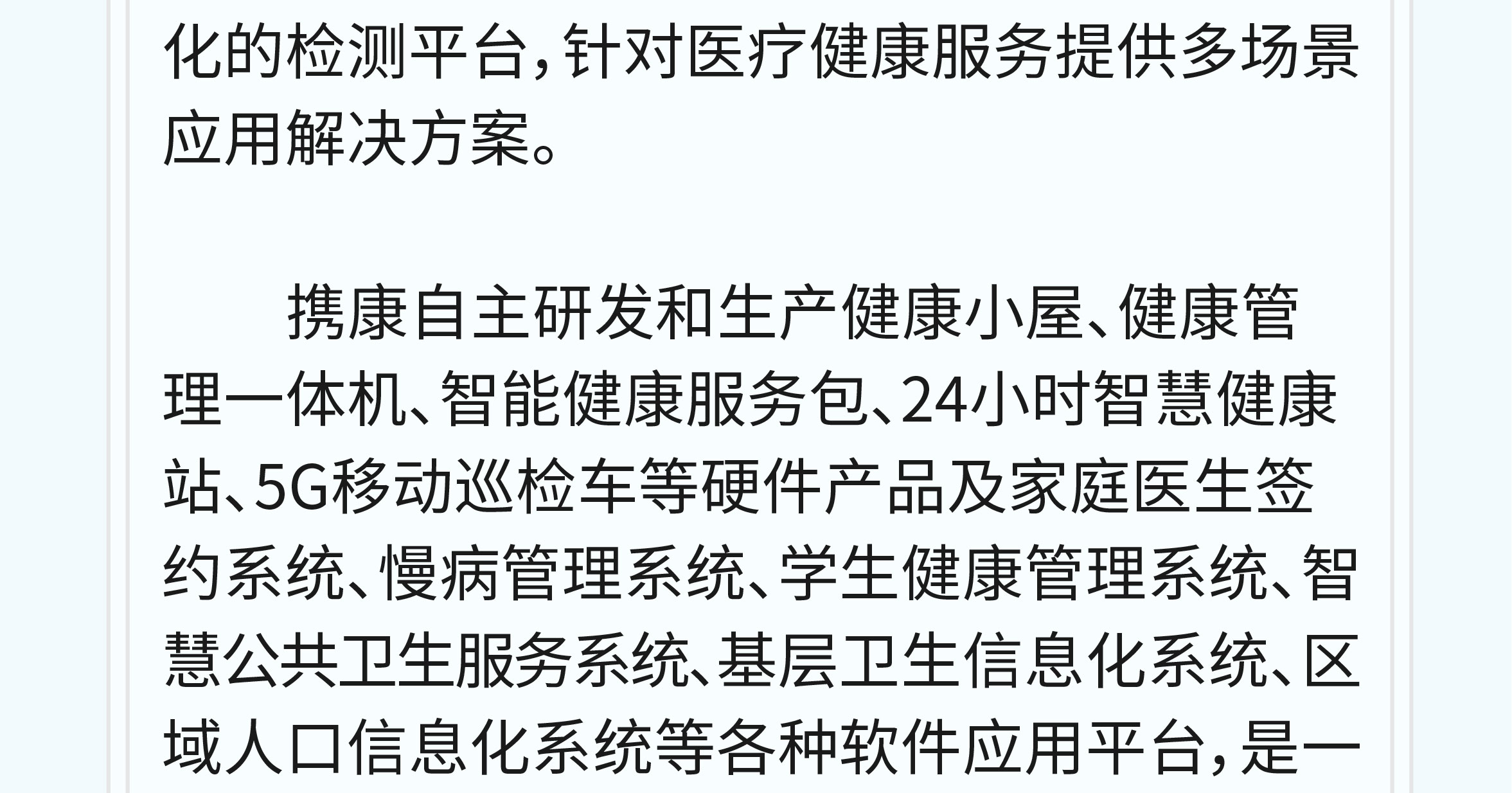 2018年,公司自主研發(fā)了集線下健康檢測、線上健康互動、線下綜合服務(wù)為一體的精準(zhǔn)健康管理平臺—攜康e加,是國內(nèi)首個以個人健康檔案、健康監(jiān)測結(jié)合自我參與的移動互聯(lián)網(wǎng)健康管理平臺。目前,攜康e加在線用戶數(shù)量已突破百萬,為用戶帶去了良好的健康管理體驗。