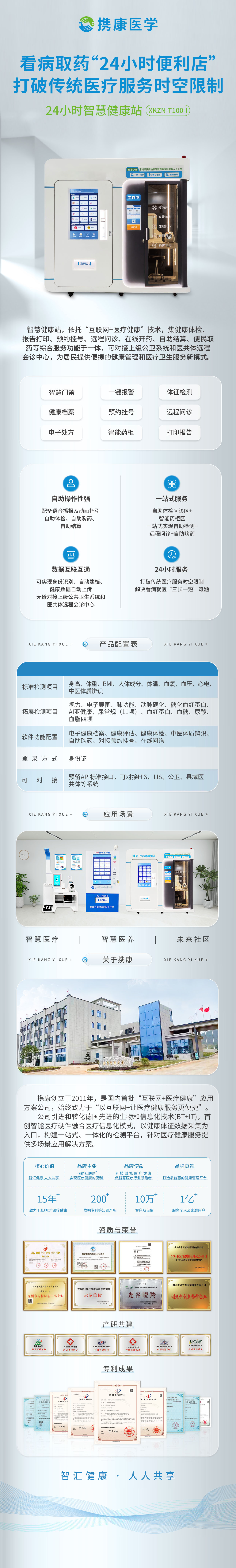 產(chǎn)品功能:互聯(lián)網(wǎng)+物聯(lián)網(wǎng)融合支持遠(yuǎn)程問診,1000+藥品在線購買24H便民服務(wù)居民家門口的智慧服務(wù)站,隨時(shí)隨地自助檢測、自助拿藥健康管理全流程閉環(huán)檢測+問診+開方+購藥一體化服務(wù)